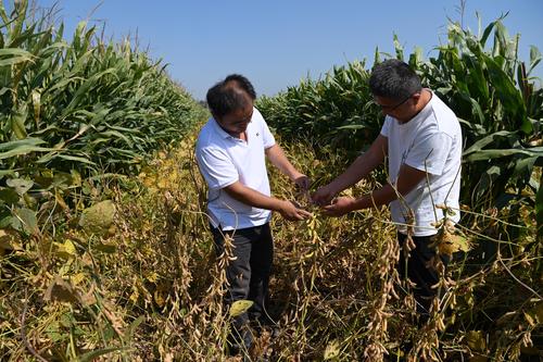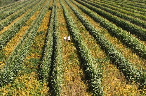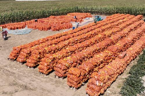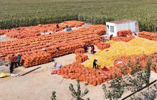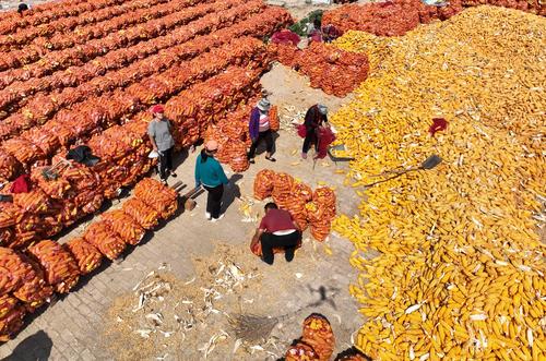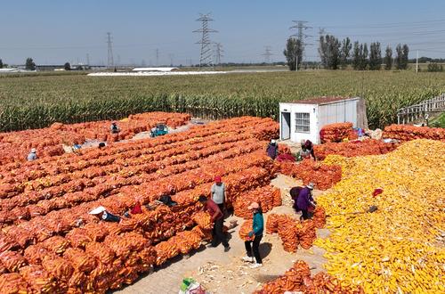 2022年9月28日,在山东省聊城市东昌府区闫寺街道大徐村,农民在晾晒收获的玉米(无人机拍摄)。