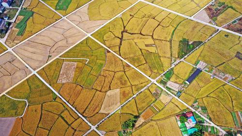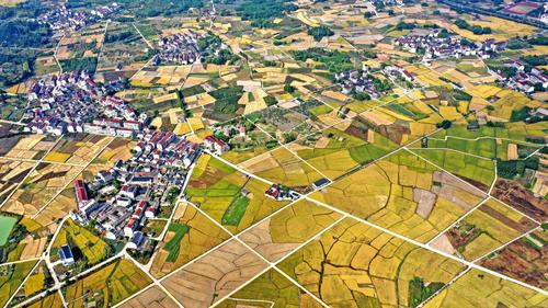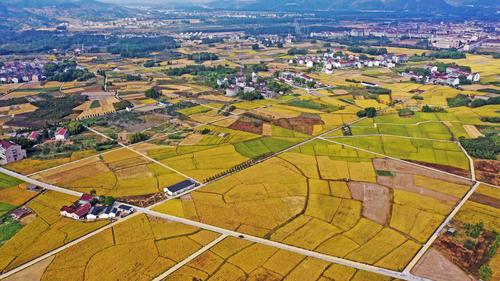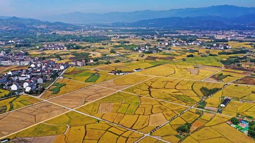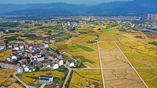 2022年10月22日,浙江省台州市仙居县白塔镇农田成片金黄的水稻与村庄、阡陌纵横的道路交织在一起,勾勒出一幅田园丰收、乡村美丽新画卷。