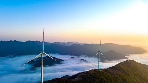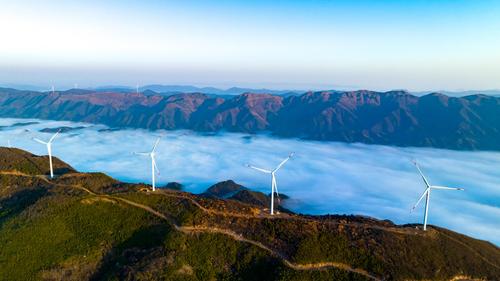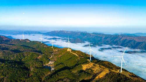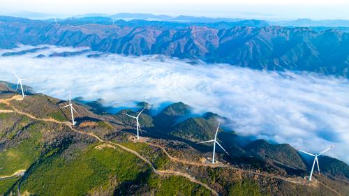 2023年3月10日,江西省瑞昌市洪下乡蜈蚣山风电场,一台台发电机矗立在群山、云海之中,勾勒出一幅仙境般的美丽画卷。