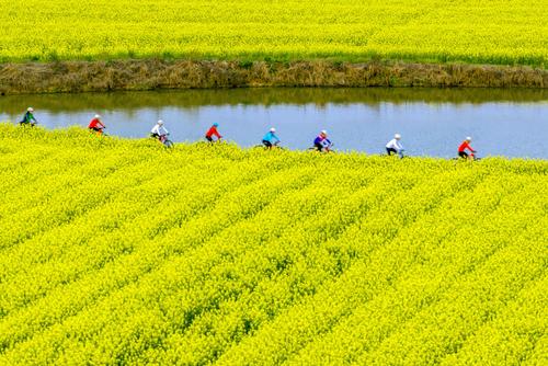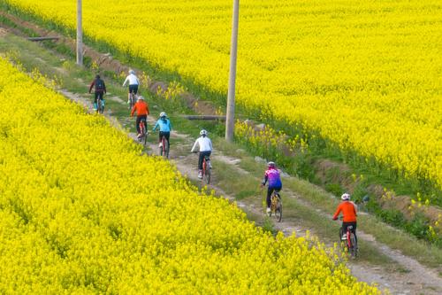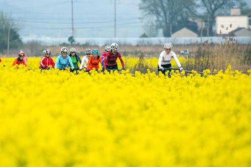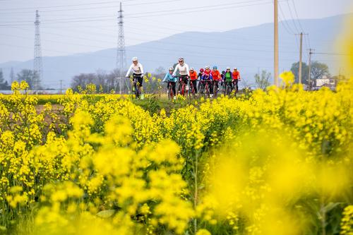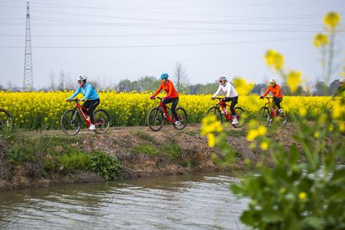 2023年3月15日,安徽省芜湖市繁昌区峨山镇沈弄村,自行车运动爱好者在油菜花田里骑行锻炼,欣赏乡村风景,享受运动快乐。时下,当地油菜花绽放正旺,田野里金色的油菜花海美景,吸引不少市民前来踏青赏花,享受春意。