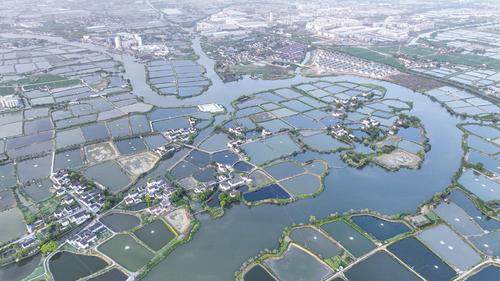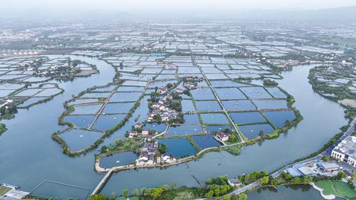 2023年4月13日,航拍浙江省湖州市南浔区和孚镇,星罗棋布的千年桑基鱼塘系统与盛开的桑树相映成趣,景美如画。