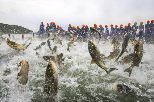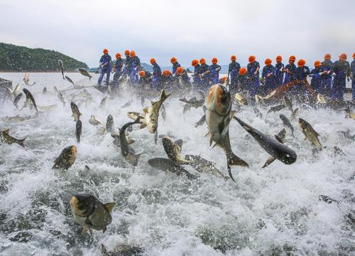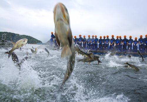 2023年5月31日,浙江省杭州市淳安县千岛湖小金山水域再现“巨网捕鱼”盛景,万鱼群跃,场面壮观。