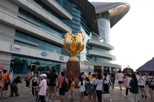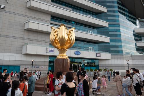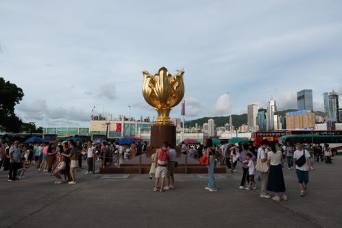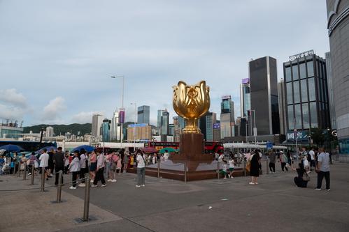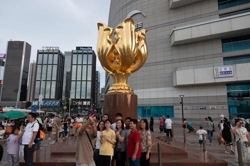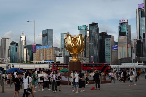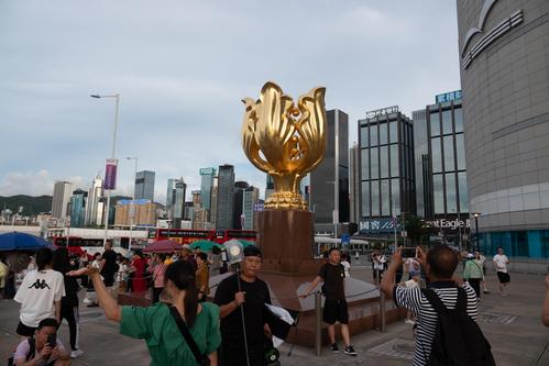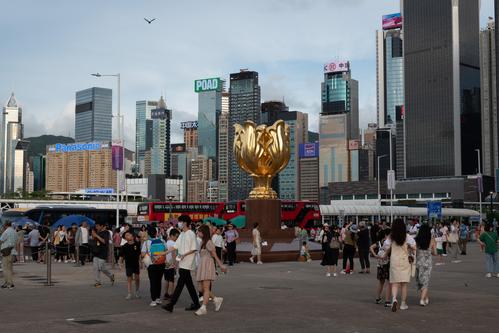 2023年7月23日,香港金紫荆广场上游客众多,来自各地的游客纷纷在此停留拍照打卡。