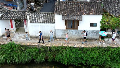 2023年8月27日,千年古村落安徽省宣城市泾县查济村,游客在古老的村巷中穿过,品味徽派传统文化的神韵,体验初秋季节旅游的惬意。