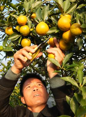 2023年11月17日,在广西柳州市融水苗族自治县致敏水果种植家庭农场,场长刘建彪采摘脆蜜金桔。