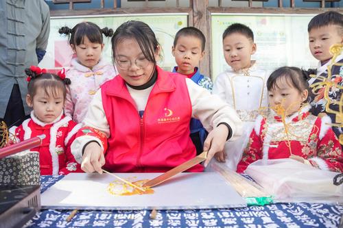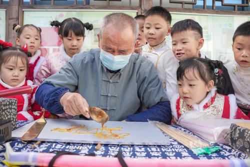 2023年11月17日,浙江省湖州市长兴县夹浦中心幼儿园的小朋友们在观看非物质文化遗产糖画的制作过程。