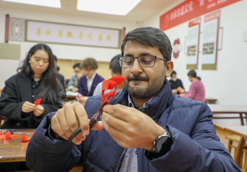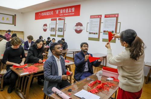 2023年12月23日,在山东省滕州市博物馆非遗传承基地,外国学生展示中国剪纸。