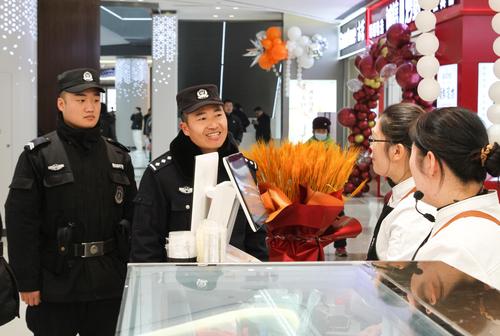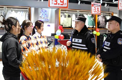 2023年12月31日,山东省临沂市郯城县公安局东关派出所民辅警向鲁商城市广场商户宣讲安全常识。
