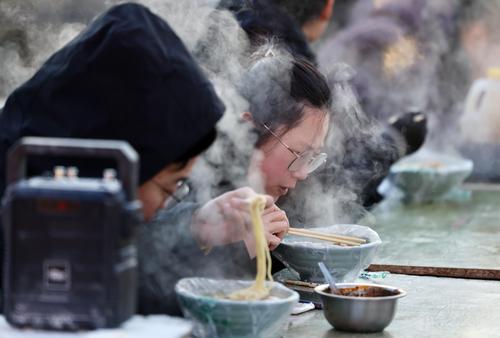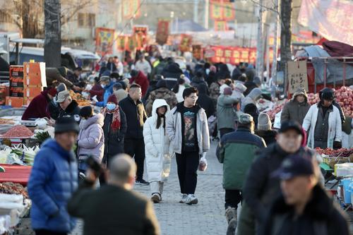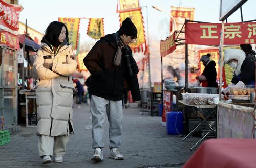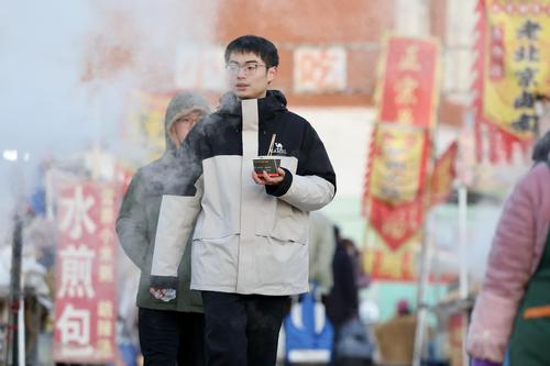 2024年1月7日,北京昌平,市民在沙河大集上购物、品尝小吃。“赶集”是中国农村的标配,如今越来越多热衷时髦的年轻人也逛起了乡镇大集。热气腾腾的羊杂汤、现烤现卖的老蛋糕、火架上滋滋冒油的烤鸡,集市上各色小吃摊前蒸腾的热气和沿街的香味令人垂涎欲滴。不少市民特地前来吃个早饭,再买上接下来一周的食材。
