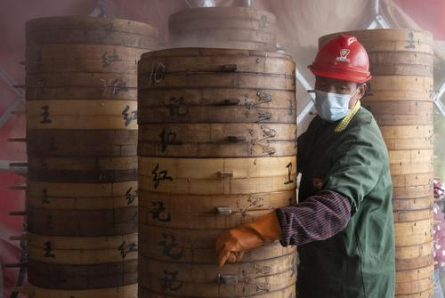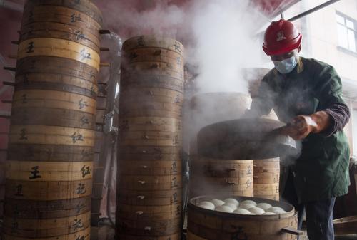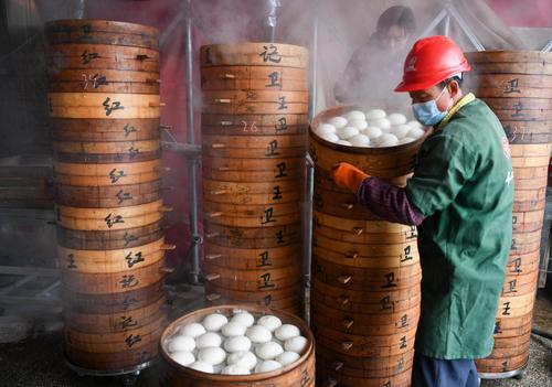 2024年2月4日,浙江省金华市婺城区新狮街道下裴村一馒头店内,员工们忙着赶制“红印馒头”,一屉屉蒸笼漫出的腾腾热气,“蒸”出浓浓的年味。