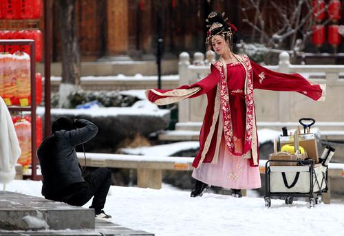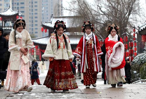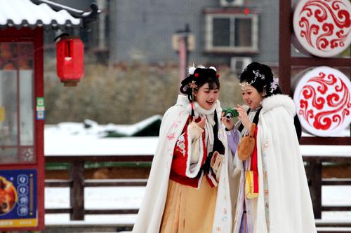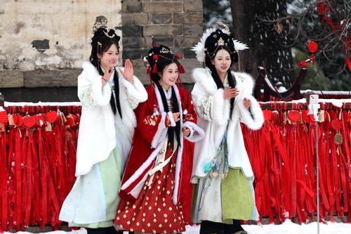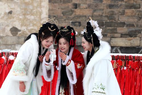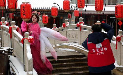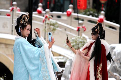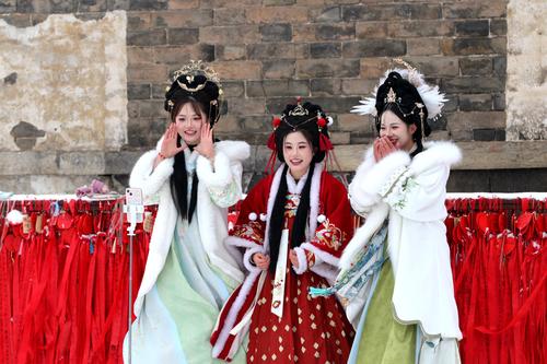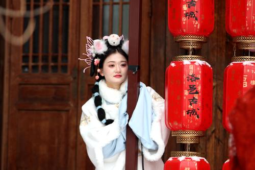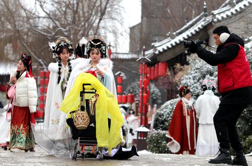 2024年2月21日,在河南省洛阳市洛邑古城景区,穿汉服拍照片的游人络绎不绝,尤其是年轻姑娘居多。洛阳是十三朝古都,近些年,在洛阳兴起了汉服热,在一些旅游景区,穿汉服搞穿越非常时尚。