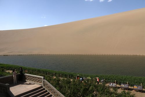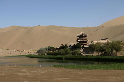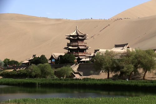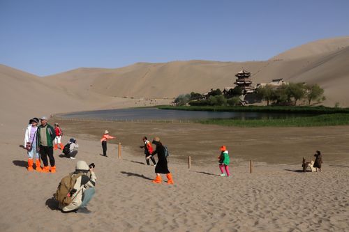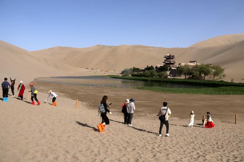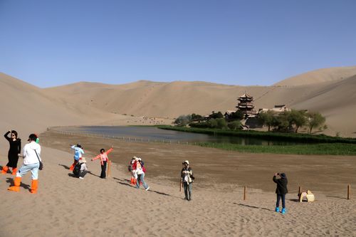 暮春时节,甘肃省敦煌市鸣沙山月牙泉景区风光迷人,大漠、蓝天、楼阁、草木、泉水构成了一幅美丽春日画卷。