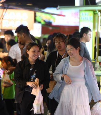 2024年5月6日晚,浙江省金华市金帆街“金谷夜市”上,客流如织,顾客在购买品尝各种风味特色小吃。