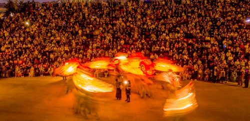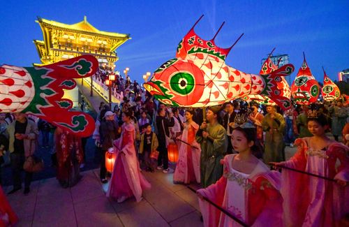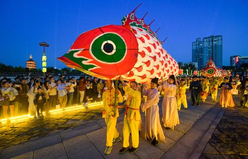 2024年10月2日,在河南省洛阳市隋唐洛阳城国家遗址公园九洲池景区,艺人们正在为游客表演安徽省省级非遗项目“汪满田鱼灯”民俗巡游节目。以鱼灯巡游,祈福国泰民安、平安喜乐,为国庆假期里的游客献上不一样的非遗体验。