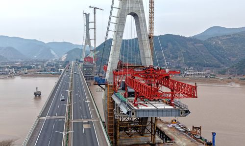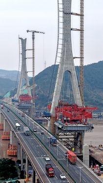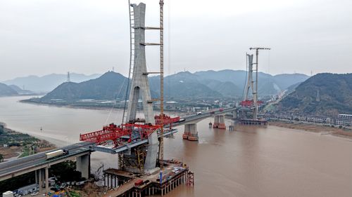 2025年2月25日,在G15沈海高速公路浙江省临海市改扩建工程灵江特大桥建设现场,工人正在抓紧施工中。