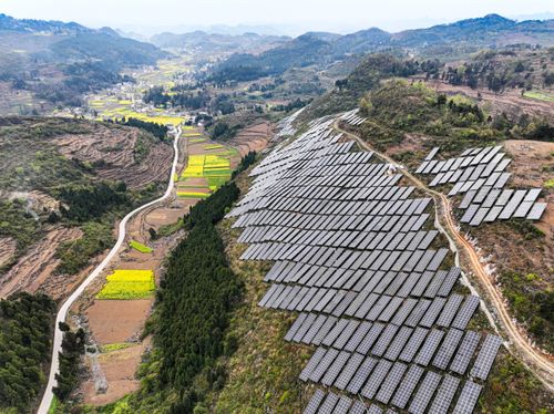 2025年4月2日,贵州省黔西市观音洞镇的发电光伏板,一排排蓝色光伏板与村庄、道路、青山遥相呼应,绘就出一幅美丽的乡村生态画卷。