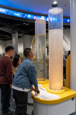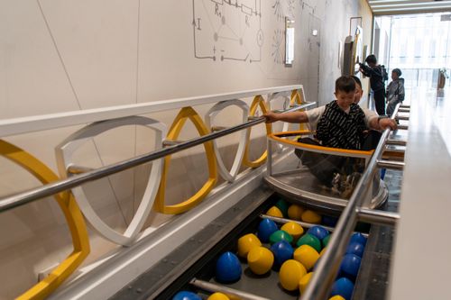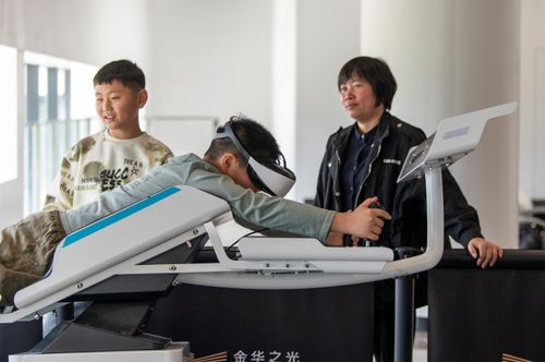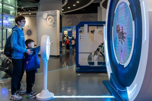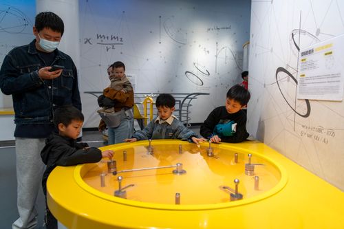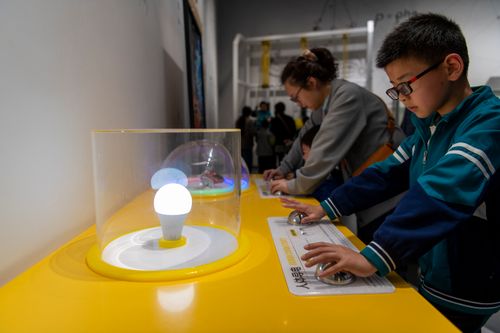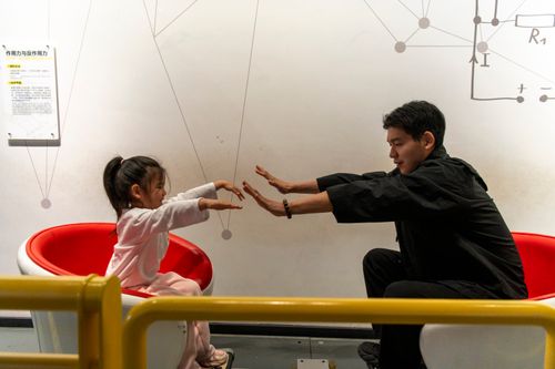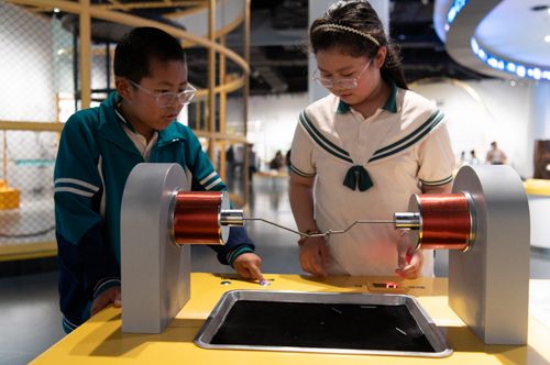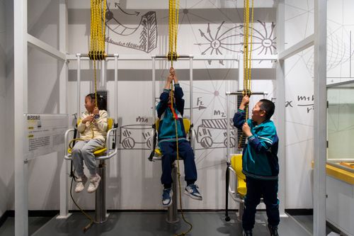 2025年4月6日,浙江省金华市科技馆里,青少年正在体验科普项目。