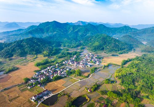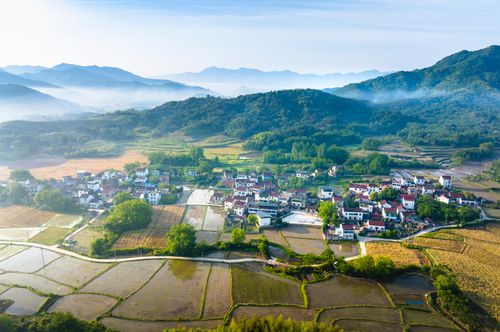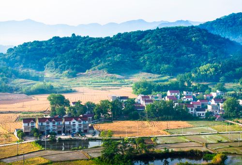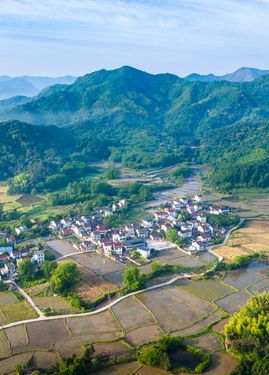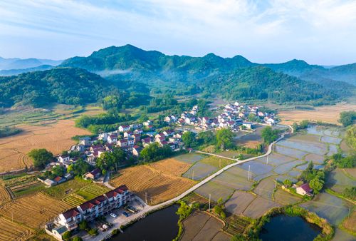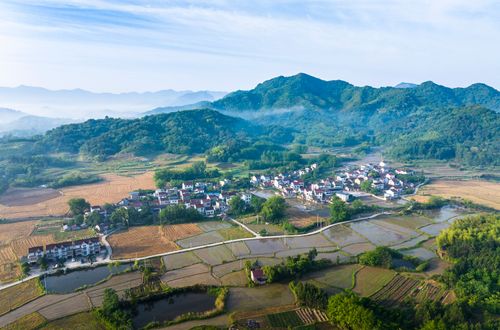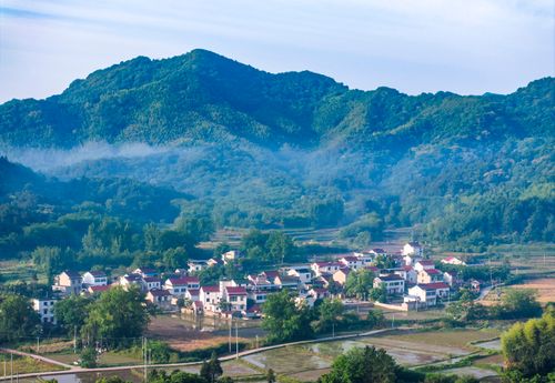 2025年5月19日,安徽省芜湖市繁昌区孙村镇赤沙社区,错落有致的民居与青山、田野、道路、晨雾等相互映衬,构成一幅生态优美的田园画卷。