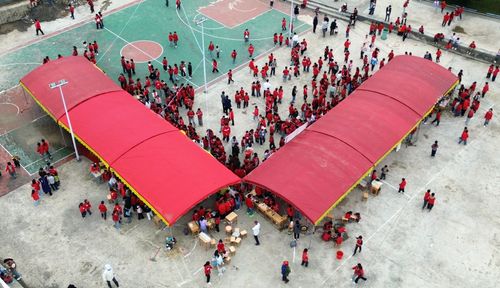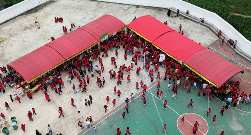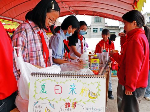 2025年5月30日,在贵州省毕节市黔西市铁石苗族彝族乡铁石小学,孩子与老师、家长正在制作、推销美食。