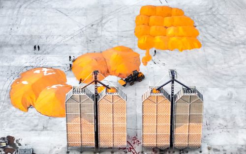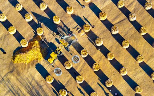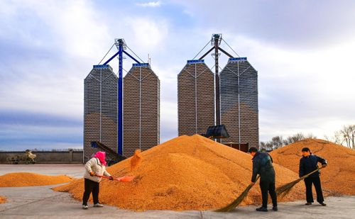 2025年11月12日,农民在兴安盟扎赉特旗申丰农牧机械专业合作社籽粒直收储粮装具前收储玉米。