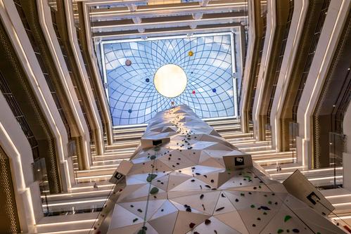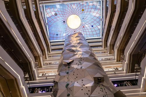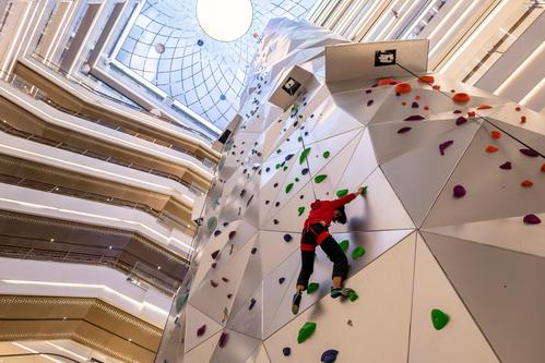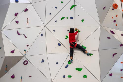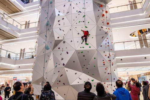 2019年12月20日,高度达55米的世界最高室内攀岩项目亮相上海新世界城,当天上午,一位运动员在攀岩墙上攀爬,吸引了众多市民顾客围观。