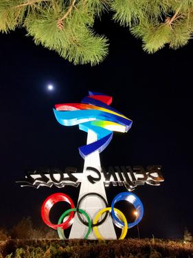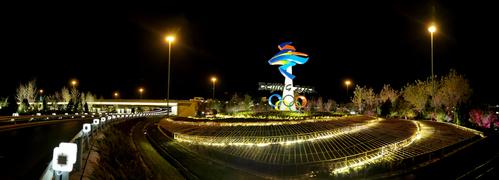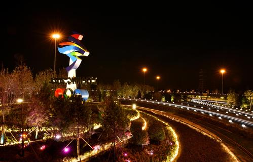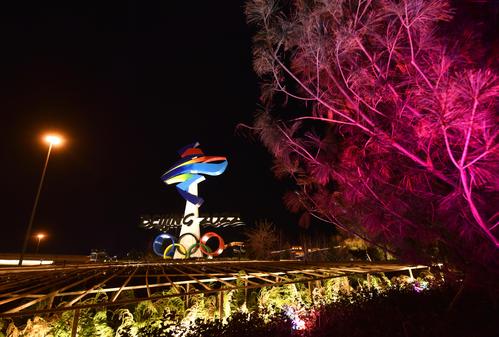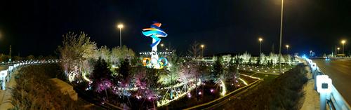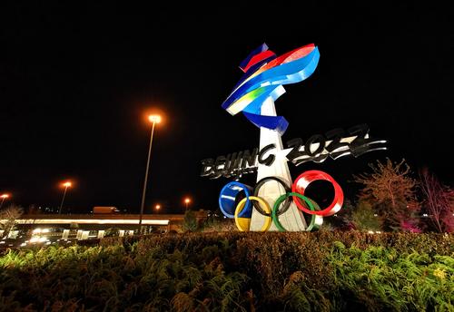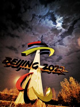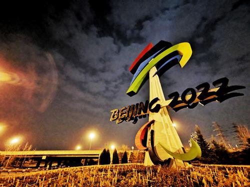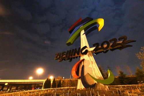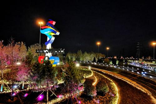 11月20日,位于北京石景山区西五环晋元桥区域的北京冬残奥会会徽雕塑在夜景照明的映衬下流光溢彩。