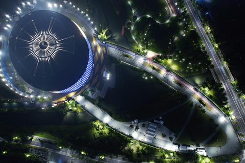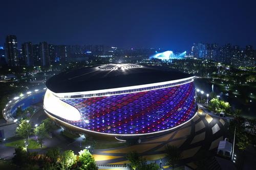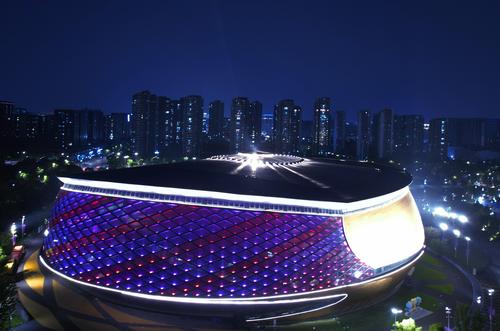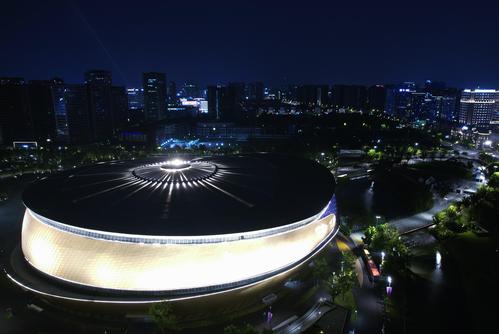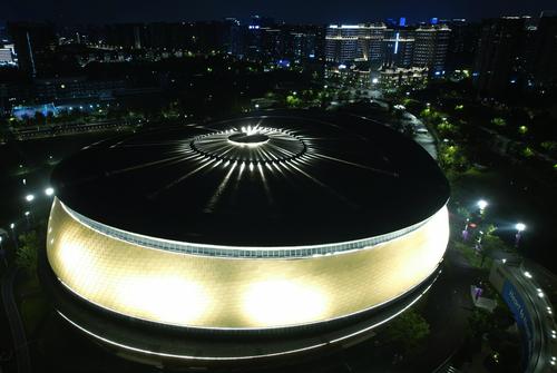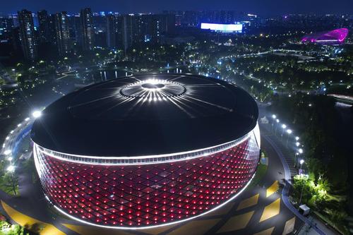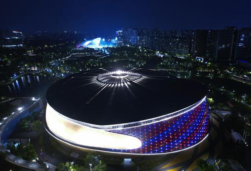 2023年9月6日晚,俯瞰杭州亚运会竞赛场馆——拱墅运河体育公园体育馆。