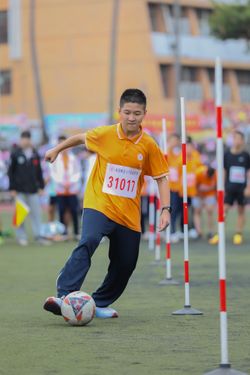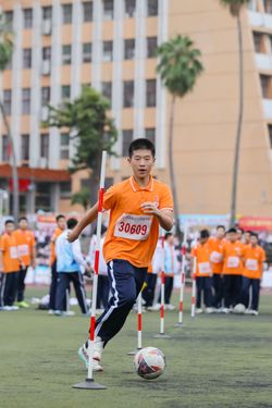 2025年10月30日,福建省福州市仓山区,福建师范大学附属中学正在举办66届田径运动会,学生进行男子足球运球绕杆项目比赛。