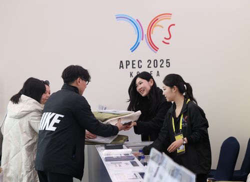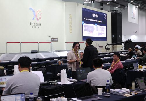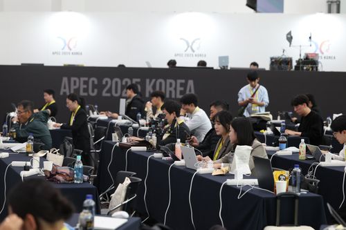 当地时间2025年10月28日,韩国庆州,媒体记者在APEC国际媒体中心内工作。亚太经合组织(APEC)第三十二次领导人非正式会议将于10月31日至11月1日在韩国庆州举行。