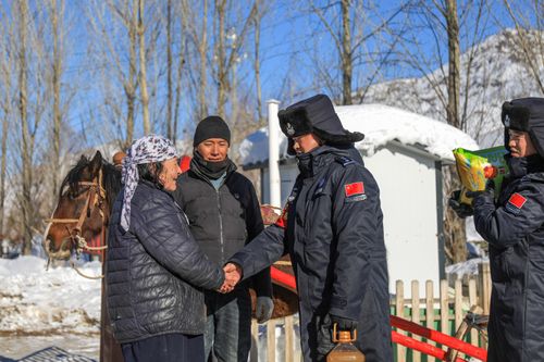 2024年12月8日,新疆阿勒泰地区部分抵边山区因降雪造成路面积雪,给辖区部分村庄农户日常出行造成不便。新疆出入境边防检查总站阿勒泰边境管理支队库卫边境派出所民警和护边员通过采取马拉爬犁的方式,走访辖区群众,梳理群众困难需求,并对困难农户开展冬季慰问,保障辖区群众平安过冬。