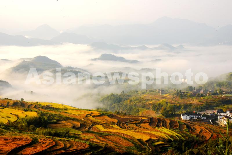 图片说明:2019年10月29日清晨,浙江省台州市仙居县,雨后的杨丰山梯田云雾缭绕。