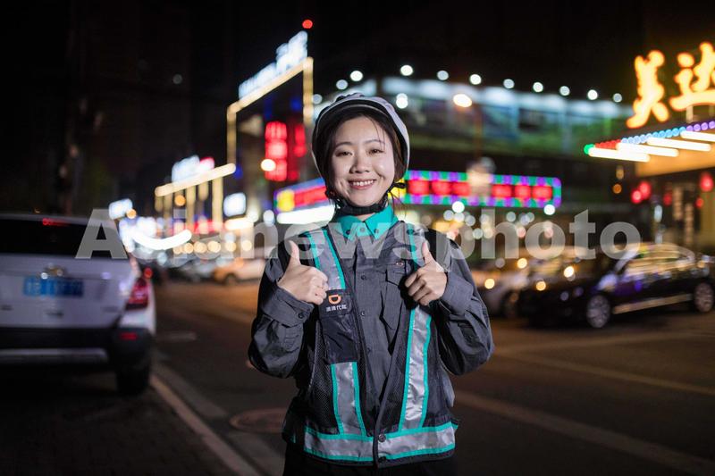 图片说明:2019年3月27日,山东省青岛市,夜晚在街头做代驾司机的杨雪绒。
