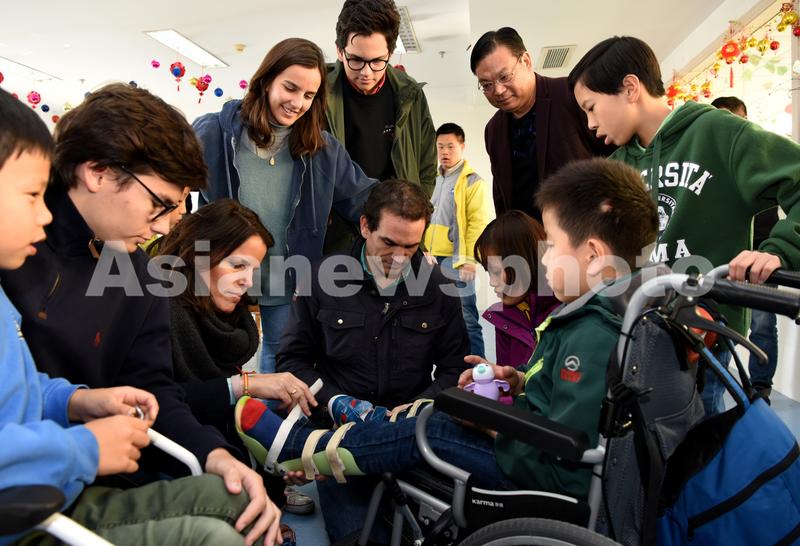 2019年11月20日,江苏省淮安市儿童福利院,来自西班牙的GOMEZ SAMBLAS夫妇(中)为他们领养的孩子张锐穿矫正鞋。