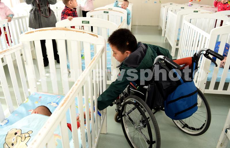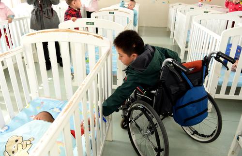 2019年11月20日,江苏省淮安市儿童福利院,来自西班牙的GOMEZ SAMBLAS夫妇(中)为他们领养的孩子张锐穿矫正鞋。