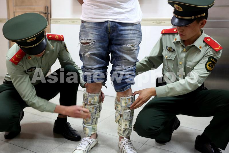 图片说明: 2014年4月23日,驻守在深圳“中英街”的广东省公安边防总队第六支队查获一起特大违规超带外币现钞案,一名男子将现金用胶带绑在腿上试图入关。经调查,该男子涉嫌超带外币共计58万美元,约合人民币362万元。 (王须/中国日报亚洲新闻图片网)