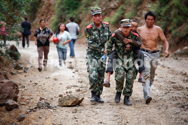 图片说明: 2014年8月3日16时30分,云南省昭通市鲁甸县发生6.5级地震,这是当日傍晚武警官兵背着抢救出来的伤员进行安全转移。(张广玉/中国日报亚洲新闻图片网)