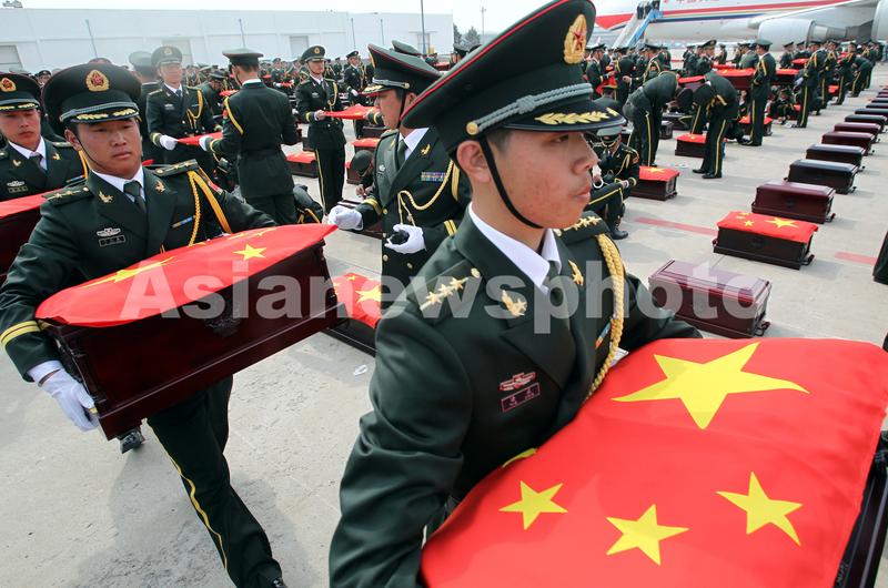 图片说明: 2014年3月28日,搭载437具中国人民志愿军烈士遗骸的专机降落在辽宁省沈阳桃仙国际机场,离开祖国60多年的烈士英灵回家。这些遗骸被安放于沈阳“抗美援朝烈士陵园”。 (张威/中国日报亚洲新闻图片网)