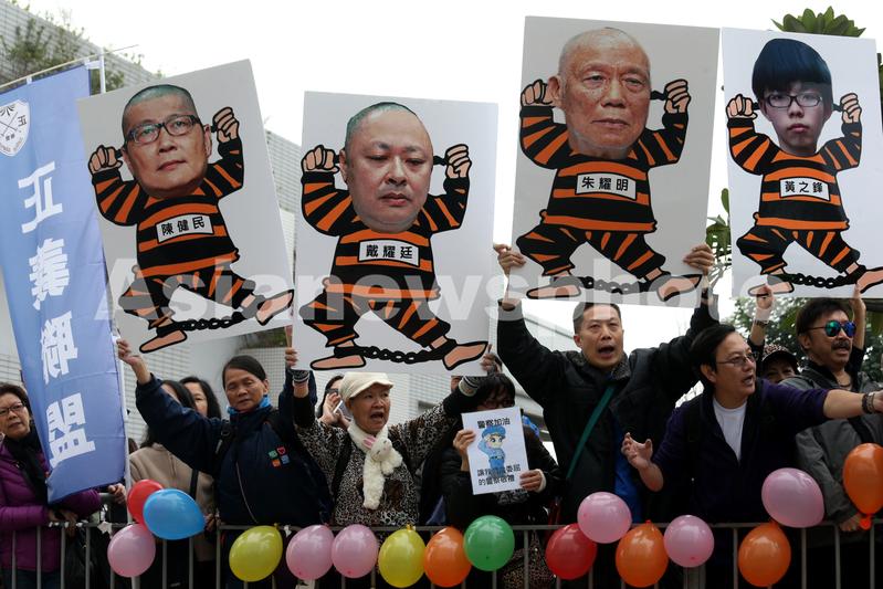 图片说明: 2014年12月3日,部分香港市民在中区警署外,举着印有几位违法“占中”发起人身穿囚服的纸牌,高喊“坐牢”的口号。(邓永安/中国日报亚洲新闻图片网)
