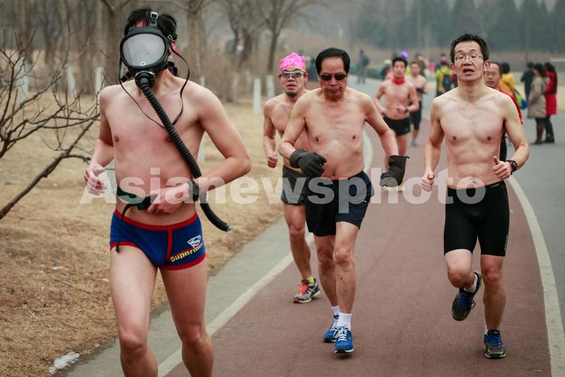 图片说明: 2014年2月23日,北京奥林匹克森林公园,一名跑步爱好者戴着防毒面具在雾霾中参加第三届奥森“光猪跑”活动。(冯永斌/中国日报亚洲新闻图片网)