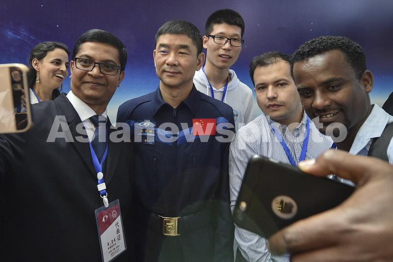 图片说明:2018年4月24日,黑龙江哈尔滨,在哈工大举办的“中国航天日”主场活动中,空间技术合作与应用国际培训班学员与中国航天员刘伯明合影。 宿东 摄