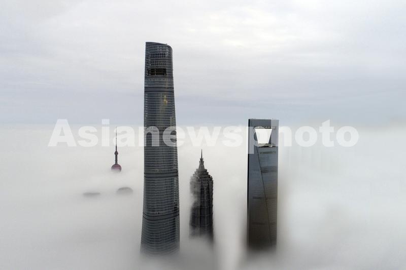 图片说明:2018年1月16日,上海陆家嘴,摩天大楼被云雾笼罩。上海中心气象台于当日发布大雾橙色预警。黄伟国 摄