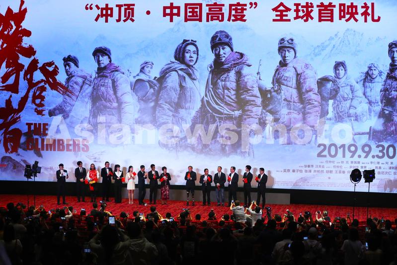 2019年9月27日,夏伯渝(中)与电影《攀登者》主创团队参加在上海影城举行的全球首映礼。