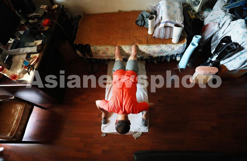 2018年8月21日,夏伯渝在北京家中做俯卧撑锻炼身体。