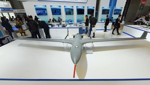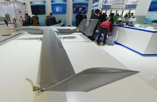 2019年12月3日,在中国船舶集团展台上拍摄到的国产新型舰载小型固定翼无人机。