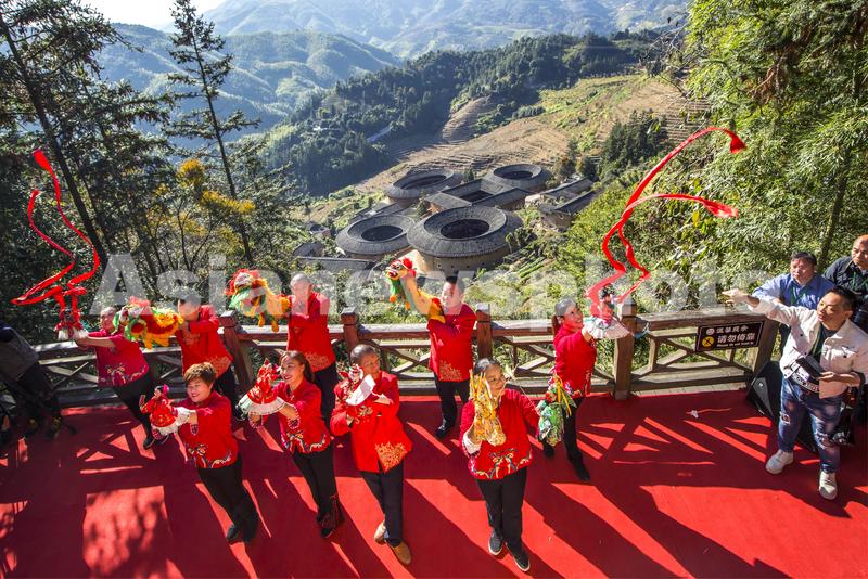12月3日,南靖田螺坑土楼群的观景台上,当地艺人用掌上木偶表演迎接八方宾客。