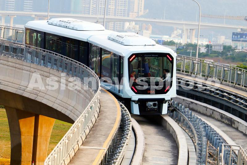 图片说明:12月10日,澳门轻轨从氹仔客运码头站开出。