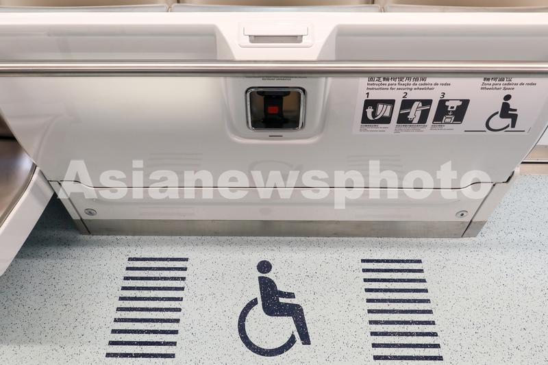 图片说明:12月10日,澳门轻轨氹仔线车厢内的残障人士专用区域。