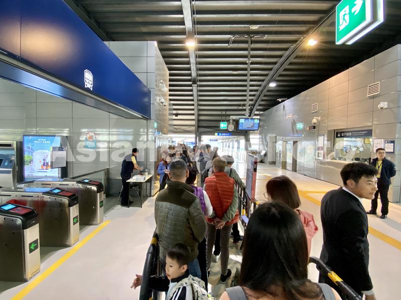 图片说明:12月10日,澳门轻轨氹仔线海洋站,等候进站的乘客。
