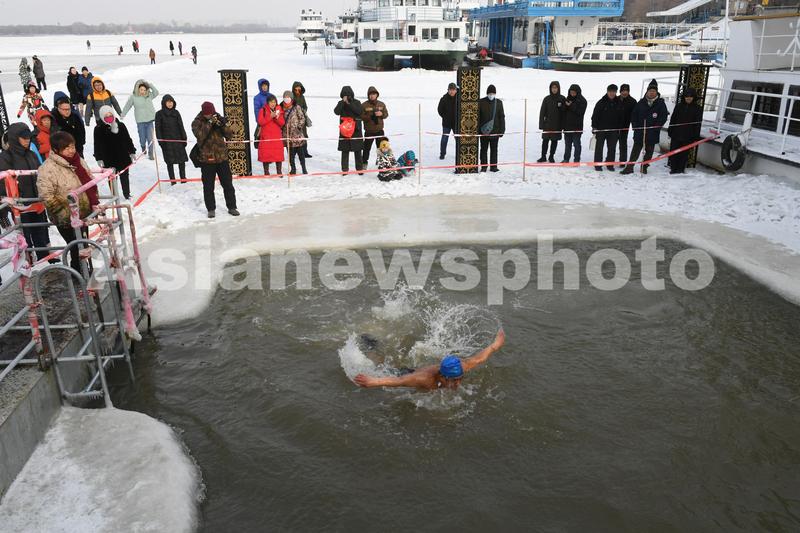 图片说明:2019年12月15日,哈尔滨,冬泳爱好者在松花江里游泳。