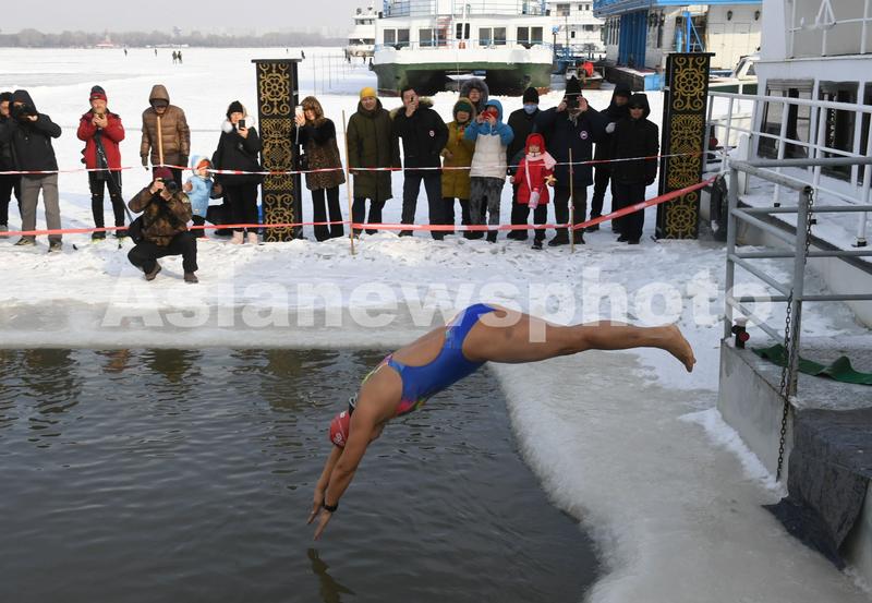 图片说明:2019年12月15日,哈尔滨,冬泳爱好者跳入松花江里。